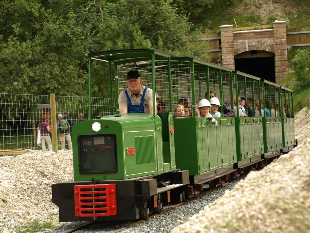 Från mitten av maj till mitten av augusti avgår gruvtåget från kalkverket och passerar flintastenar, stenbrott och kalkstenspelare. Dessutom får du uppleva underjordiska bäckar och sjöar. Under den här turen får du en bra inblick i det tidigare dagbrottet. Ändhållplats för gruvtåget är den stora sjön med biografen.