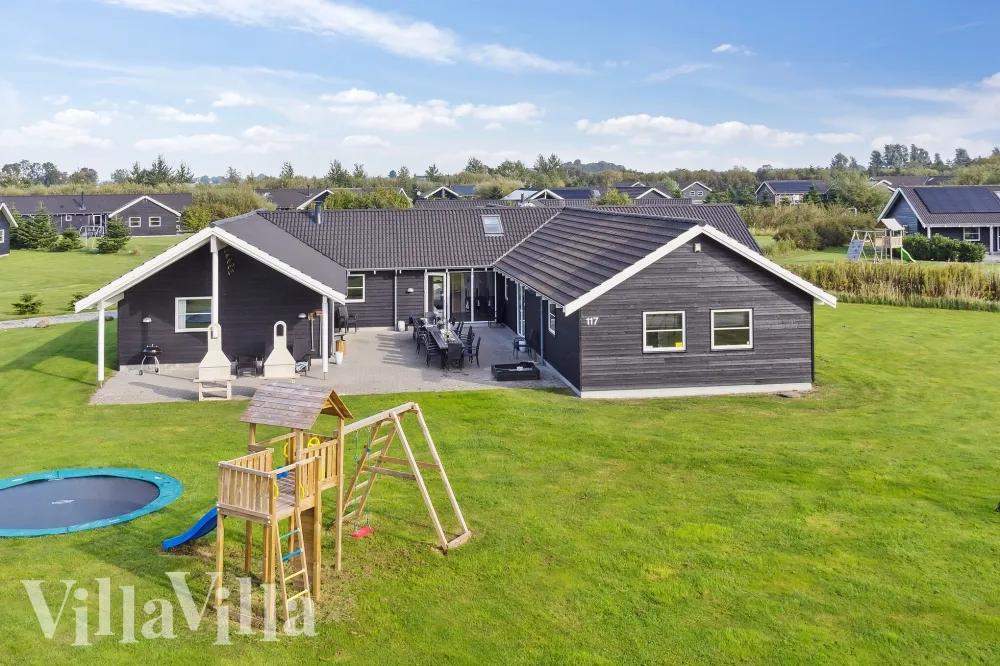 Terrassen är delvis övertäckt och perfekt till att njuta av den danska sommaren. För de minsta gästerna finns både sandlåda, gungor och en stor härlig gräsplan.