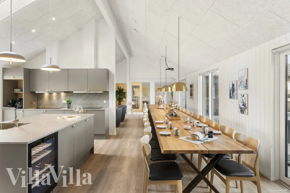 Det stora XL-köket är den perfekta samlingspunkten för matglada gäster, där det finns plats för att laga mat sida vid sida. Med ett vinkylskåp integrerat i köket har ni alltid koll på temperaturen, vare sig ni har champagnebrunch eller vin till middagen. Hela rummet smälter samman med vardagsrummet, där det långa matbordet ger goda förutsättningar för samtal, skratt och oförglömliga middagar.