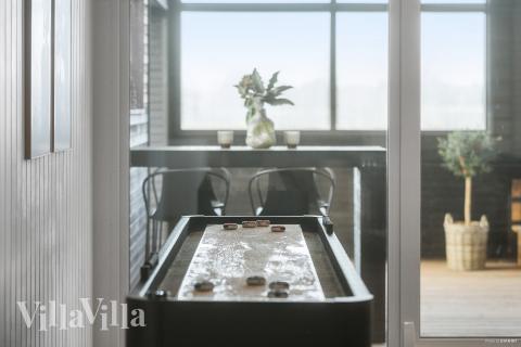 Och när energin flödar kan ni gå till aktivitetsrummet, där shuffleboard, biljard, bordsfotboll, bordtennis och dart är redo för timmar av roliga tävlingar. Det finns självklart också PlayStation 5 för spelälskare och en mjuk soffhörna för de som bara vill ta det lugnt med en bra film. Om ni behöver arbeta lite eller om företaget ska samlas för strategisamtal så finns det projektor och duk, och efter kan ni fira de goda idéerna i loungen. Utomhus finns en övertäckt lounge med bar, en alldeles speciell plats, där ni kan ta en kall dryck och njuta av kvällar med lugn loungemusik och goda skratt, oavsett väder.