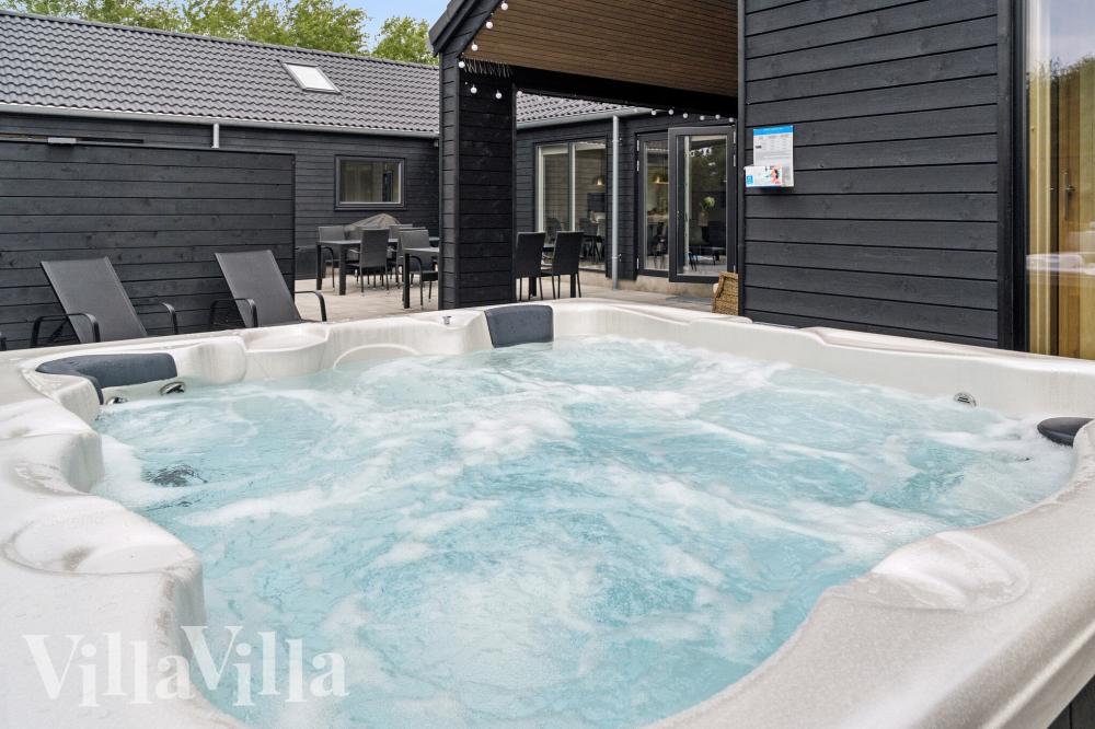 Inne i huset börjar semestern på allvar i den imponerande poolavdelningen. Här kan både barn och vuxna njuta av många timmars skoj med en vattenrutschkana och en pool på 20 m² med inbyggd motströmsanläggning. När kroppen behöver omvårdnad väntar bubbelpool och bastu utomhus i husets mysiga wellnessområde – perfekt för en lugn stund under bar himmel, medan du kopplar av.