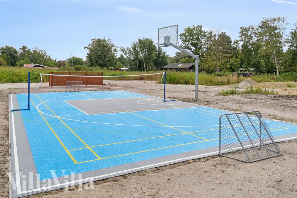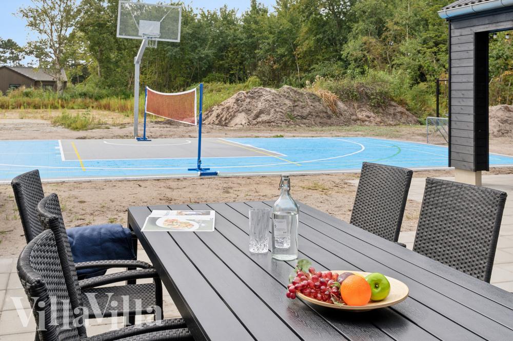 Den stora och delvis övertäckta terrassen är samlingspunkten när ni vill vistas utomhus. Här kan ni avnjuta måltider vid det långa matbordet, med rätter tillagade på grillen. Barnen kan leka fritt på studsmattan och i lektornet, medan de vuxna kopplar av med utsikt mot de gröna omgivningarna. Vill ni bränna energi kan ni spela beachvolleyboll, fotboll, basket eller badminton på multisportbanorna utomhus.