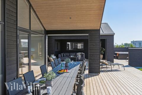 Detta lyxiga semesterhus från Skanlux är fullt av aktiviteter, som tilltalar både lekande vattenälskare och avslappnade livsnjutare. Oavsett årstid kan ni njuta av en uppfriskande simtur i den uppvärmda inomhuspoolen med vattenrutschkana. Förläng utomhussäsongen, även under kyliga vinterdagar, på den mysiga träterrassen, i wellnessområdet med utomhusspa, utomhusdusch och utomhusbastu. Här kan du verkligen koppla av och njuta av välbefinnande under stjärnorna. Under varma sommarkvällar kan du slå dig ner i loungemöblerna och grilla, medan barnen kan leka i trädgården på studsmattan eller gungorna.