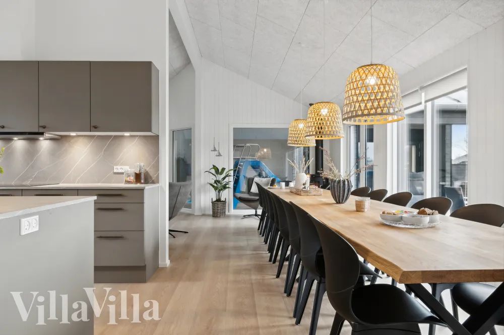 Sommarhusets stora kök/allrum utgör hjärtat i det här VillaVilla-huset. Med den bekväma soffhörnan, det stora öppna köket och ett stort matbord med plats för alla 20 gästerna bjuder huset in till mysiga gemensamma måltider och minnesvärda kvällar tillsammans.