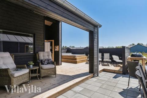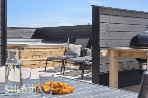 På den härliga terrassen finns tre grillar som alltid är redo att användas tack vare det övertäckta utomhusköket. Här kan ni njuta av måltiderna vid det långa matbordet och sedan koppla av med en drink i de sköna loungemöblerna under halvtaket, samtidigt som ni har uppsikt över husets yngsta gäster som hoppar på studsmattan.