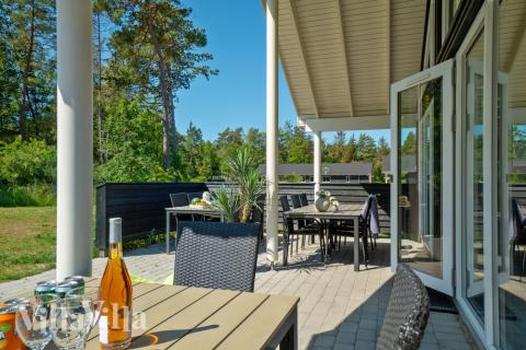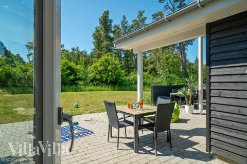 Lyxhusets trädgård är också mycket tilltalande. Den stora terrassen är delvis täckt och möblerad med stilrena möbler. Här finns också en grill för trevliga grillkvällar. Medan de vuxna grillar eller kopplar av på terrassen kan barnen leka i trädgården. Förutom gunga och sandlåda finns här också en studsmatta. Din hund kan också busa runt i trädgården, eftersom upp till två husdjur är tillåtna i semesterhuset.