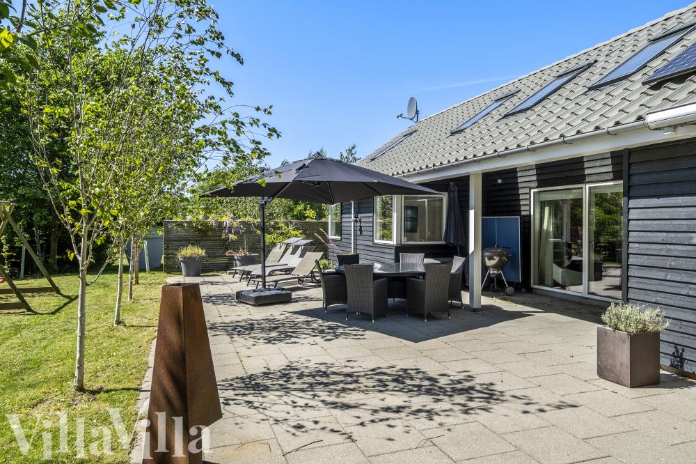 Den 200 m2 stora kaklade terrassen längs hela husets trädgårdssida är möblerad med bekväma trädgårdsmöbler, loungeområde och solstolar, samt en markis, baldakin, parasoller och 2 Weber kolgrillar. Trädgården är anlagd med gräs för bollspel etc. och avgränsas i söder av en hög vall.