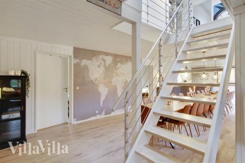 Köket är välinrett med både två diskmaskiner, kylskåp, ugnar och spisar, vilket gör det lättare att laga mat till många. Vid det långa bordet kan alla ha det trevligt och äta tillsammans.