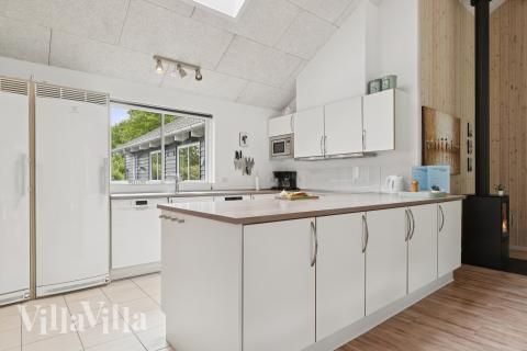 Köket är stort och välinrett med allt som behövs till semesterns matlagning. Från köket och matplatsen kan man kika på de som badar i poolrummet.