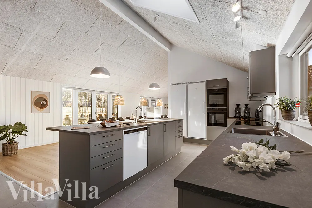 Bostaden har ett imponerande XL-kök som är fullt utrustat med två kylskåp, två diskmaskiner och två ugnar för att laga måltider för stora grupper. Den öppna planlösningen gör det enkelt att laga mat tillsammans, och den stora matplatsen har utrymme för att alla ska kunna njuta av måltiderna tillsammans. Efter maten kan ni slå er ner i de mjuka sofforna och njuta av lugnet med en film eller ett spel.