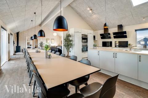 Mitt i sommarhuset ligger köket/allrummet med ett välutrustat kök, trevlig soffgrupp och ett långt matbord med plats för 30 personer,