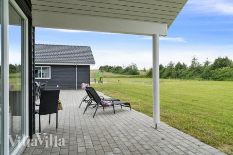 Sommarhuset har en delvis övertäckt terrass med trädgårdsmöbler och grill, där man kan koppla av medan barnen leker i trädgården, gungar eller bygger sandslott i sandlådan. Familjens fyrbenta vänner (upp till tre husdjur) är naturligtvis också hjärtligt välkomna