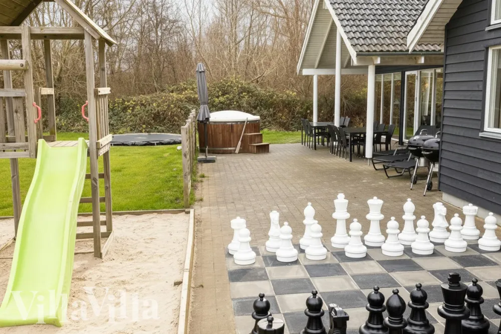 Den stora terrassen har sköna trädgårdsmöbler, och på den stora tomten som omger huset har man även tänkt på de minsta gästerna med gungor, lektorn, trampolin och sandlåda. Här finns också en mysig lägereldsplats, perfekt för att baka bröd på pinne och njuta av en kväll tillsammans, samt jätte schack, som bjuder på roliga tävlingar och gemensamma skratt under bar himmel.