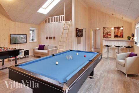 Huset har ett imponerande ”badland” där det kan simmas, badas och slappas i timvis. Här ryms en 18 m2 stor pool med vattenrutschbana och motströmsanläggning, ett härligt 6-persons spa-bad och stor bastu.